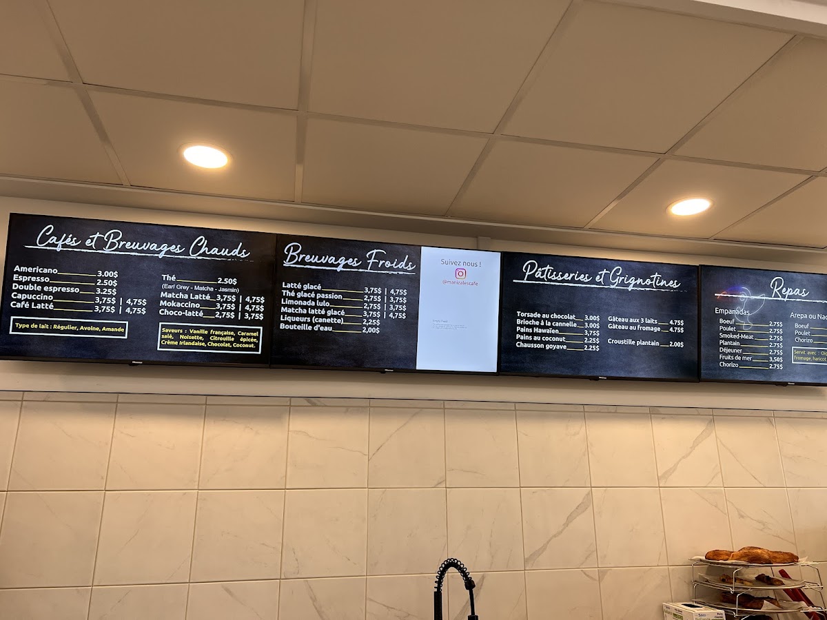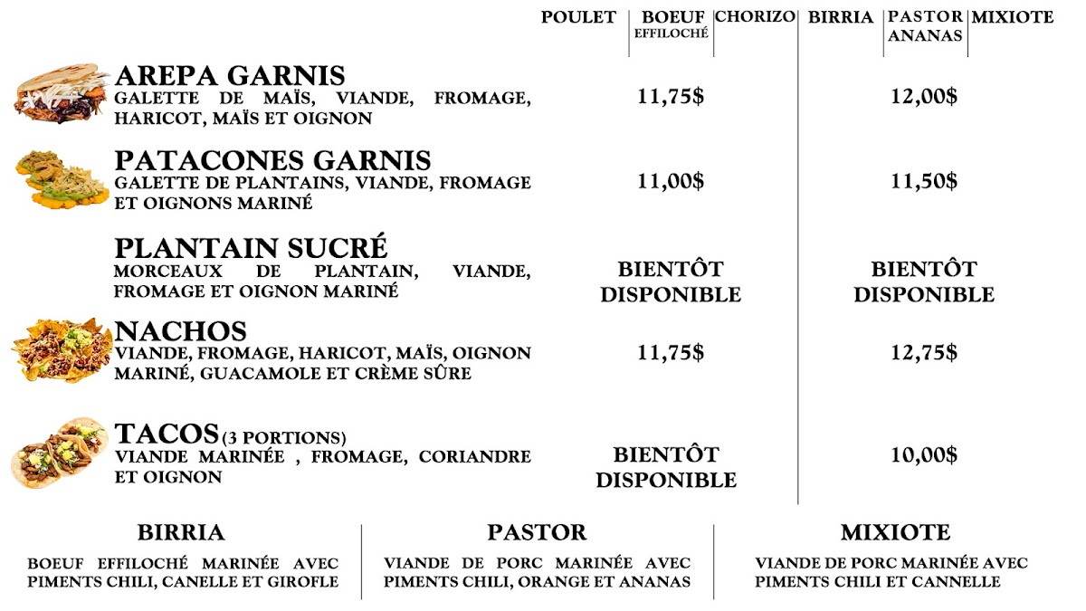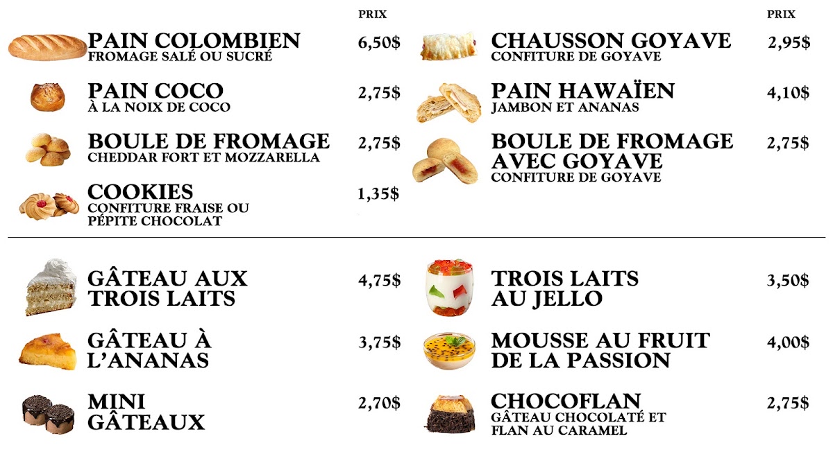 From a reviewer’s perspective, the menu at Café Manizales offers a diverse and comforting selection of Colombian-inspired dishes and drinks that make for a satisfying culinary experience. The savory options such as Caldo De Castilla, Quesadillas Mixtes / Mixtas, Arepa Ou Patacon Avec Chorizo Colombien / Arepa O Patacón Con Chorizo Santarrosano, Patacones Garnis Mixtes / Patacones Rellenos Mixtos, and Tacos (3 Portions) Mixtes / Tacos (3 Porciones) Mixtos provide hearty, flavorful choices that highlight traditional ingredients and generous portions. The beverage menu complements the food well, with refreshing cold drinks like Macchiato Glacé / Macchiato Frio, Thé Passion / Jugó Maracuyá, Mocaccino Glacé / Mocaccino Frio, and Matcha Glacé / Matcha Frío, alongside comforting hot drinks such as Americano, Chocolat Chaud / Chocolate Caliente, Caramel Macchiatto, Matcha, and Café Latté. For those with a sweet tooth, the bakery and dessert section features treats like Mini Gâteaux / Mini Pasteles, Gâteaux Aux Trois Laits / Tortas De Tres Leches, Pain Colombien / Pan Colombiano, Cookies / Galletas, and Chocoflan, rounding out the menu nicely. The selection also includes convenient frozen products such as Flautas De Hot-Dog Sac 10 Unités, Bâtonnets De Goyave Et Fromage Sac 10 Unités, Empanadas Plantain Et Fromage Sac De 10 Unités, Empanadas Poulet Sac De 10 Unités, and Boule De Fromage Sac 5 Unités, as well as ready-to-eat items like Empanada À La Viande Fumée (Smoked Meat), Flautas Hot-Dog (3 Portions), Lechona Receta Tolimense, Empanada Chorizo, and Flauta Hot-Dog Unité, making the menu both varied and appealing for different tastes and occasions. Overall, the menu reflects a rich mix of traditional flavors, casual comfort foods, and satisfying beverages that leave a positive and memorable impression.
